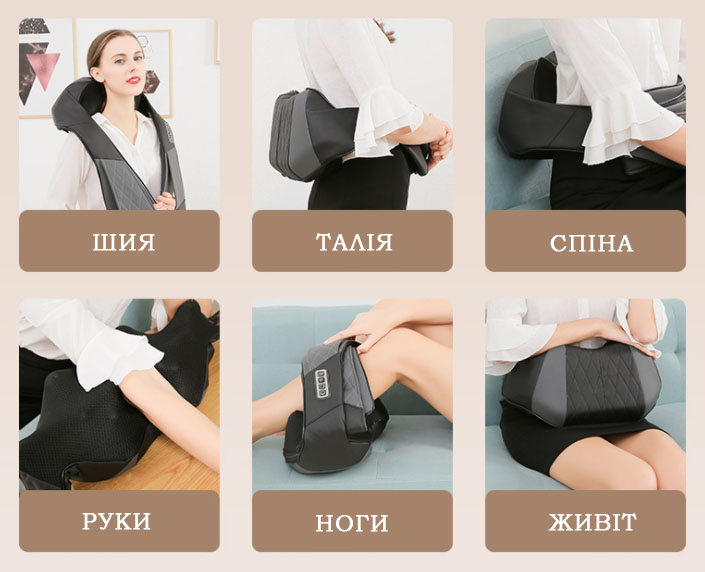 Массажер выполняет глубокий разминающий массаж за счет вращающихся роликов и дополнительно оснащен функцией инфракрасного прогрева, что способствует расслаблению мышц и улучшению кровообращения.