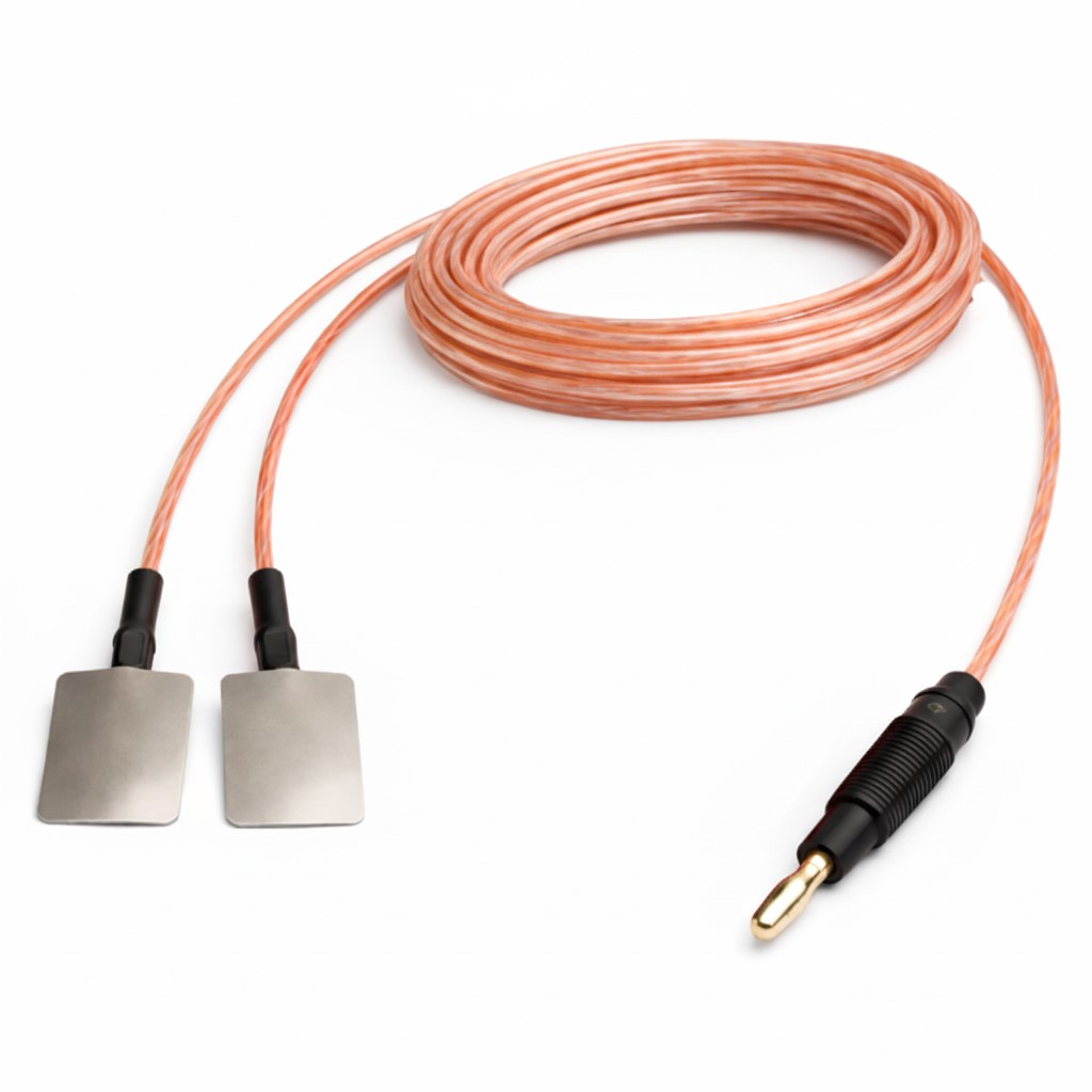 Кабель пациента (токоподвод) для аппаратов электрофореза и гальванизации. С металлическими электродами и штекерами 4мм. Тип токоподвода - РАЗДВОЕННЫЙ.