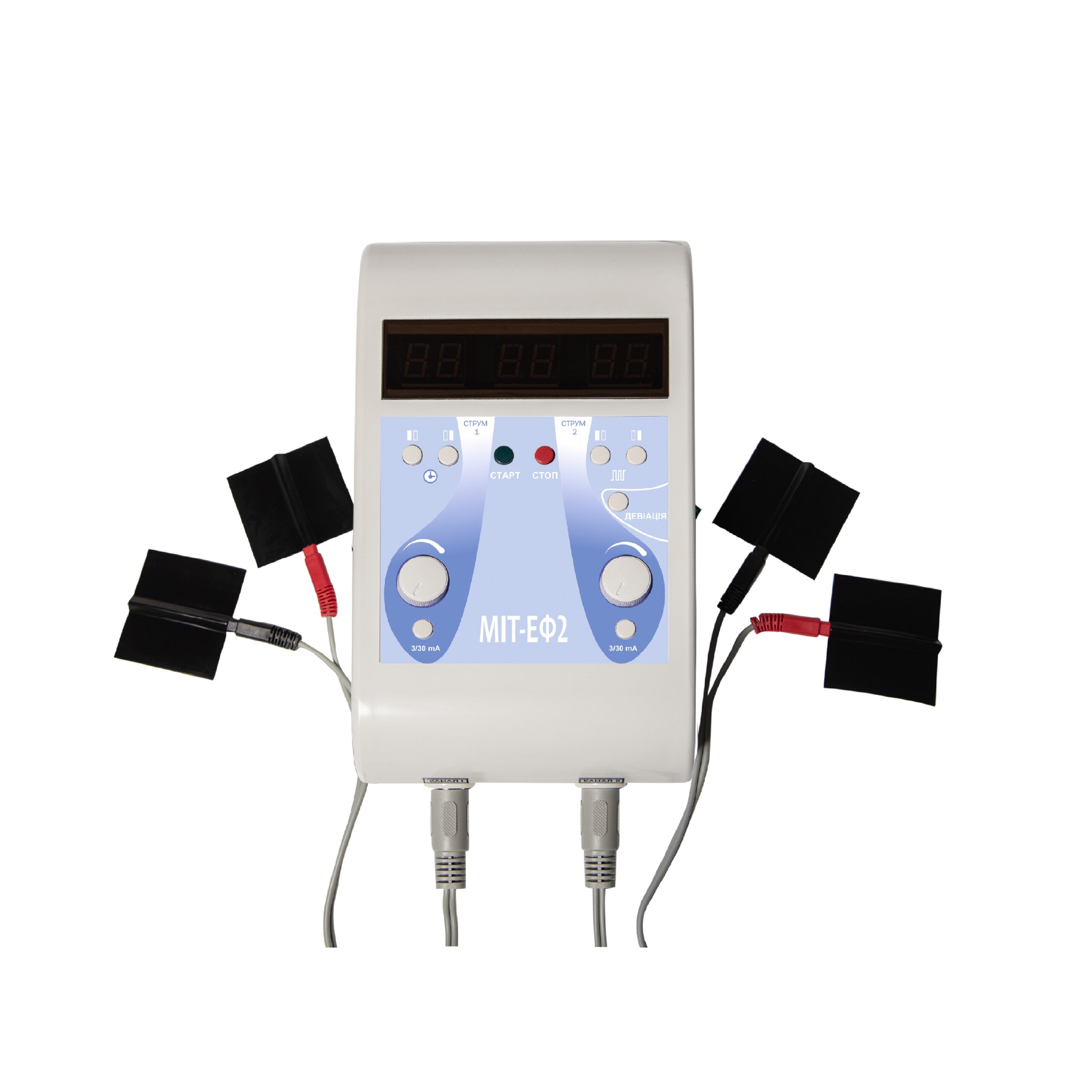 МІТ-ЕФ2 формує стабільний терапевтичний електричний струм з можливістю точного регулювання сили, частоти та тривалості процедури. Два незалежні канали дозволяють одночасно впливати на різні зони тіла або проводити симетричні процедури.